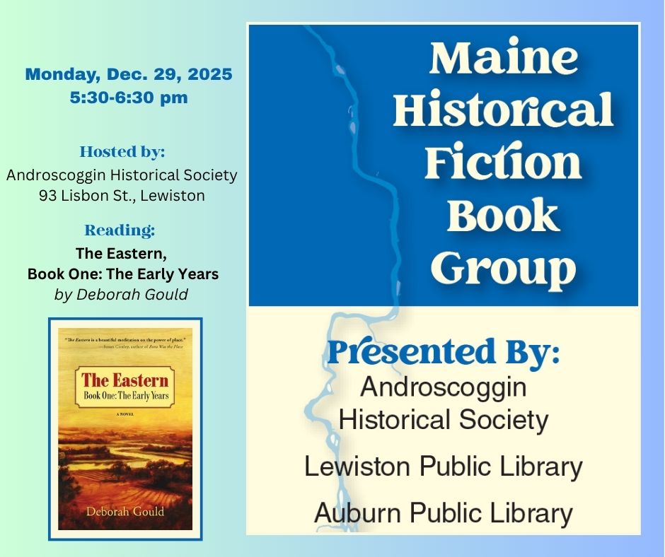 Events View Events as a List View Events as a Calendar 03 January Family, Land & LegacyDate January 3, 2026Time 11:00 am - 12:30 pmLocation 93 Lisbon StMore Info 05 January Maine Historical Fiction Book ClubDate January 5, 2026Time 5:30 pm - 7:00 pmLocation 93 Lisbon StMore Info 26 January Maine Historical Fiction Book ClubDate January 26, 2026Time 5:30 pm - 7:00 pmLocation Lewiston Public LibraryMore Info